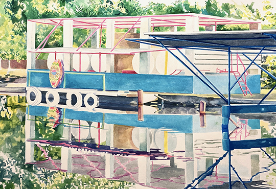 Par ses grands formats aux couleurs éclatantes, Marion Charlet nous ouvre les portes d’un monde à la fois familier et irréel, déserté de toute présence humaine. Le visiteur est invité à entrer dans la peinture, comme happé par ces paysages idéalisés aux contre-plongées vertigineuses. Il devient acteur de ce qu’il voit, habite le décor et ainsi, est invité à écrire sa propre histoire.