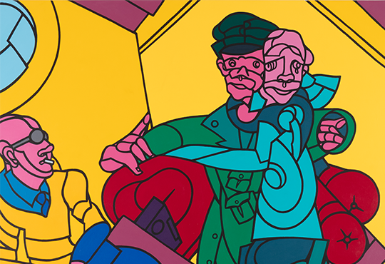 Formé à l’école des beaux-arts de Milan, il a rapidement su se distinguer par un style résolument narratif, qui s’inscrit dans la lignée du pop art tout en puisant dans la tradition classique. Adami nous transporte dans un univers où les lignes tranchées délimitent des aplats de couleur, évoquant une réalité fragmentée et pourtant ordonnée. Ses œuvres, souvent allégoriques, explorent les tensions entre l’individu et le monde qui l’entoure, tout en questionnant la mémoire, l’histoire et l’identité.